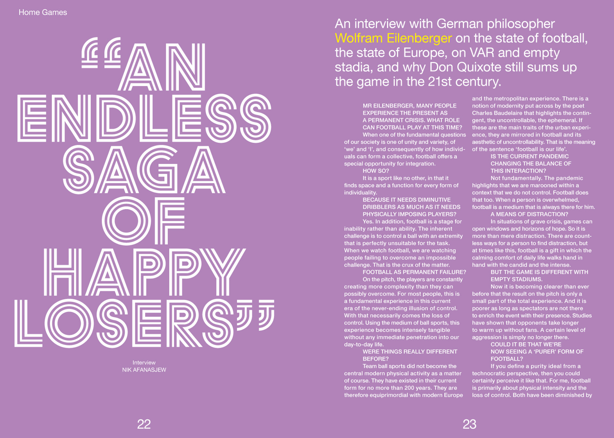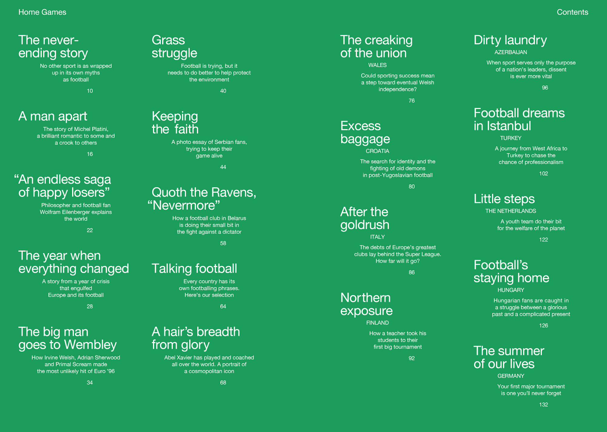 Euro 2020 (in 2021) was not what Michel Platini had in mind when he conceived of a European Championship spread across 12 nations. It was, indeed, a grand test for the rebirth of football as a spectator sport, or, as the German philosopher, Wolfram Eilenberger, calls it in his exclusive interview, a “laboratory for the future”. There were many fans present, just not as many as hoped for, so this was a strange tournament. But in his essay one of the world’s great football writers, David Winner, says that the basics, the infinite web of stories we tell about football, are, and were, largely unchanged. Just the mediums we consume it through are different. He argues that the game will always endure. But as is shown by the problematic hosts Baku as well as Budapest the old idea of using sport to enhance a government’s image abroad or at home is still being used to great effect. Football has certainly helped shine a light upon the fight against the corrupt regime in Belarus, just as it makes us face hard truths about nationalism in the Balkans.